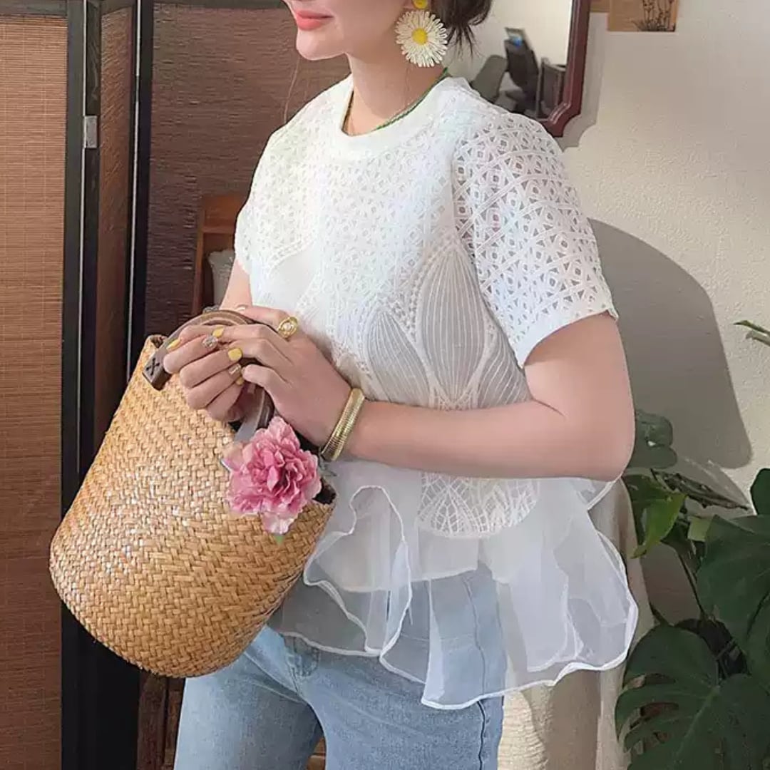 繊細なレーストップスで、ワンランク上の着こなしを。フリルが女性らしいシルエットを演出し、普段使いから特別なシーンまで幅広く活躍します。一枚でコーデが完成するトップス。