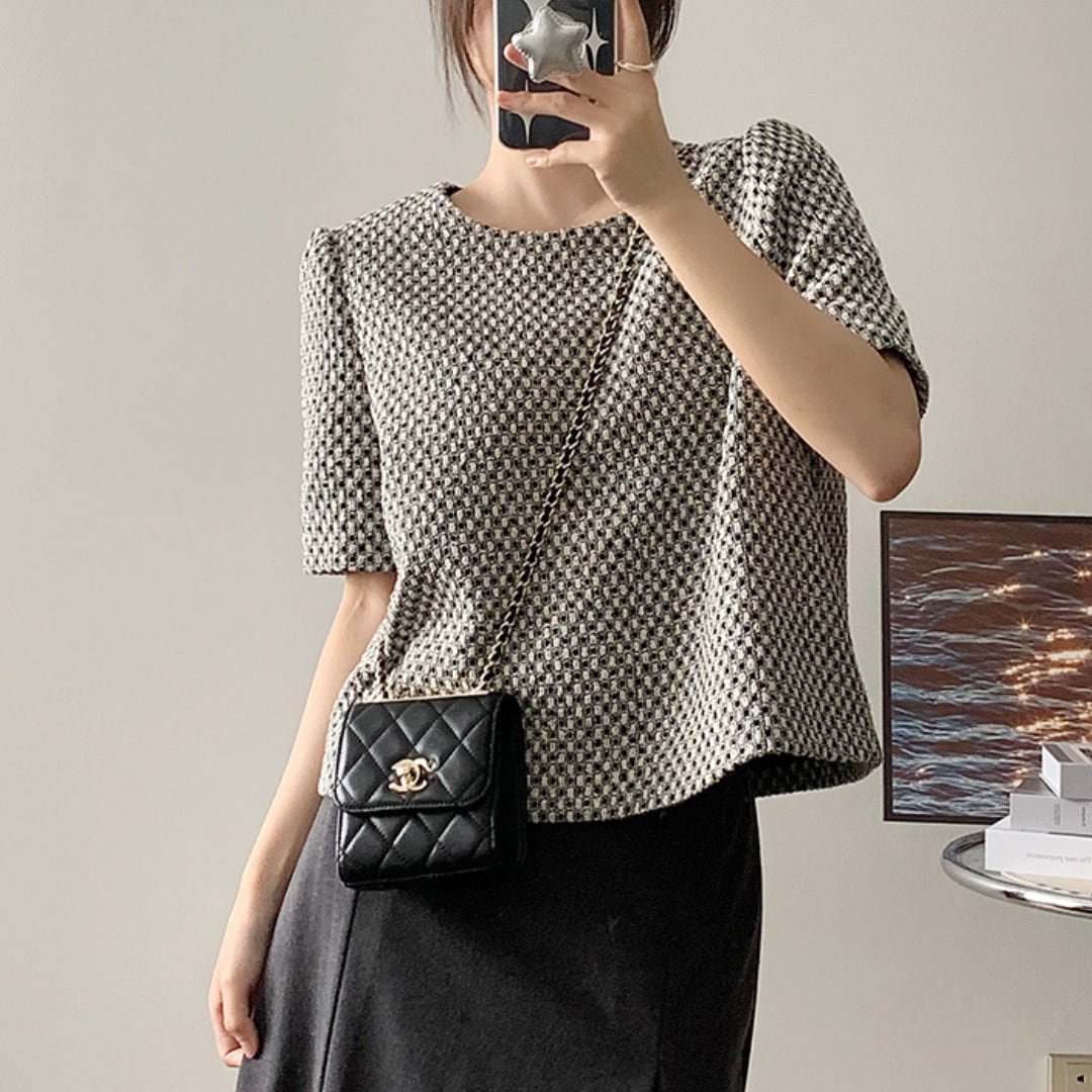 上品なツイード素材のチェック柄トップスは、まだまだ暑い今の時期にも少し秋の気配を取り入れることのできる嬉しいアイテム。