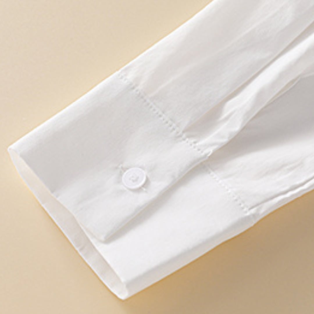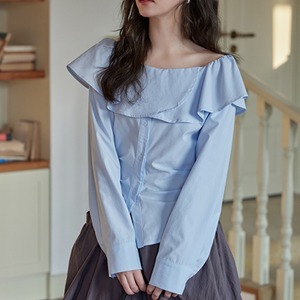 フリル襟が印象的なブラウス。上品な襟のデザインとすっきりした身頃が甘すぎない女性らしさを演出します。