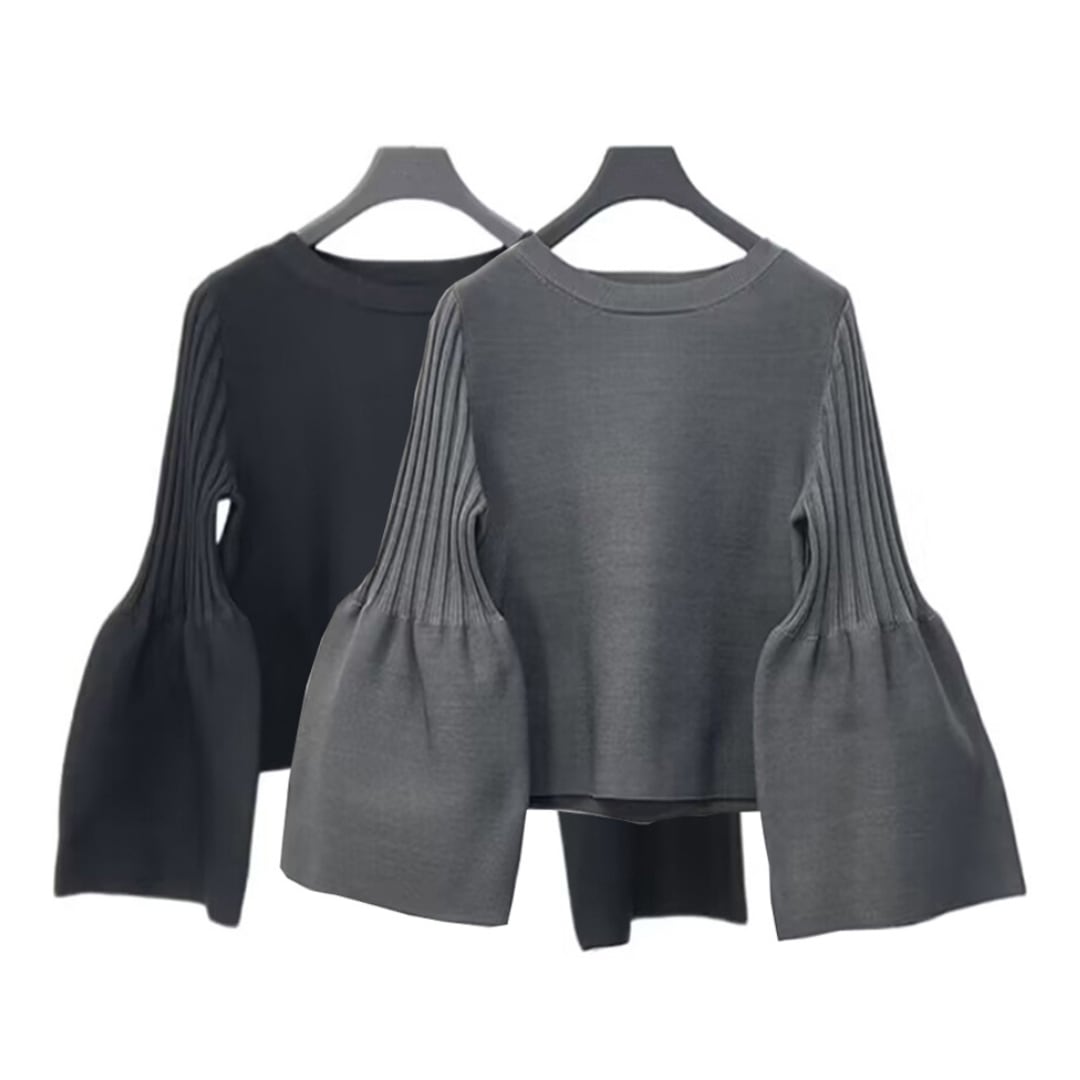 クルーネックとベルスリーブが女性らしい印象を与える七分袖プルオーバーです。すっきりとしたシルエットながら、袖のボリューム感がアクセントになり、着こなしに華やかさをプラスします。一枚で着てもサマになるデザインなので、様々なシーンで活躍します。