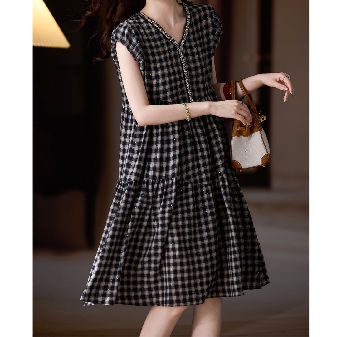甘すぎないギンガムチェック柄が魅力のワンピース。Vネックがデコルテを美しく見せ、Aラインのシルエットが女性らしい優しげな雰囲気を演出します。ノースリーブのデザインは、ジャケットや羽織を重ねれば季節を問わず長くお使いいただけるのも嬉しいポイント。