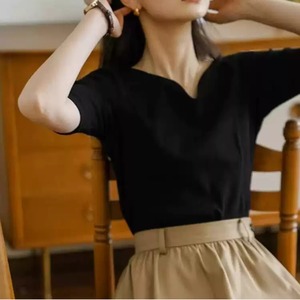シンプルなデザインながらも、緩やかなVネックが女性らしいデコルテを演出。程よくフィットするシルエットで、体型を美しく見せてくれます。