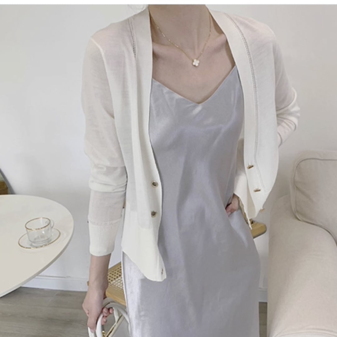 洗練されたデザインのVネック七分袖カーディガン。 ゴールドの留め具タイプのボタンがエレガント。シンプルなデザインながら、シルエットの美しさで着るだけでこなれた印象に。1枚持っていると便利なアイテムです。