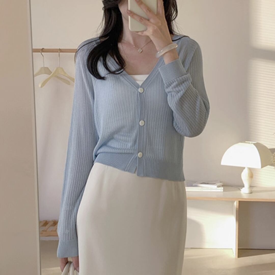 上品な透かし編みが魅力のニットカーディガン。Vネックのデザインがデコルテを美しく見せ、着回し力抜群。