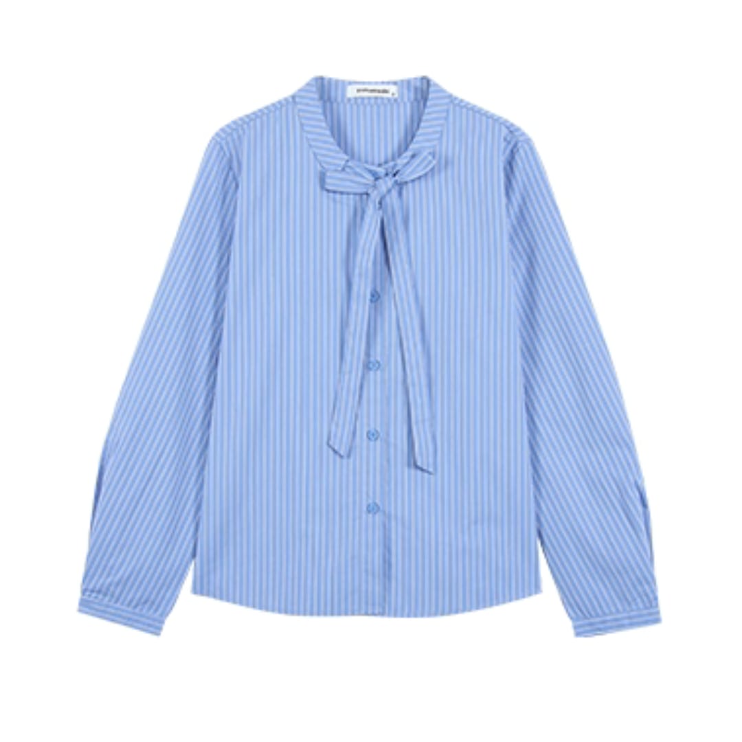爽やかなストライプ柄と、可愛らしいボウタイが魅力的なブラウス。すっきりとしたシルエットで、様々なボトムスと合わせやすく、デイリーユースにぴったりです。カーディガンやジャケットと合わせてボウタイをのぞかせるのも可愛い。今から春まで3シーズン大活躍アイテム。