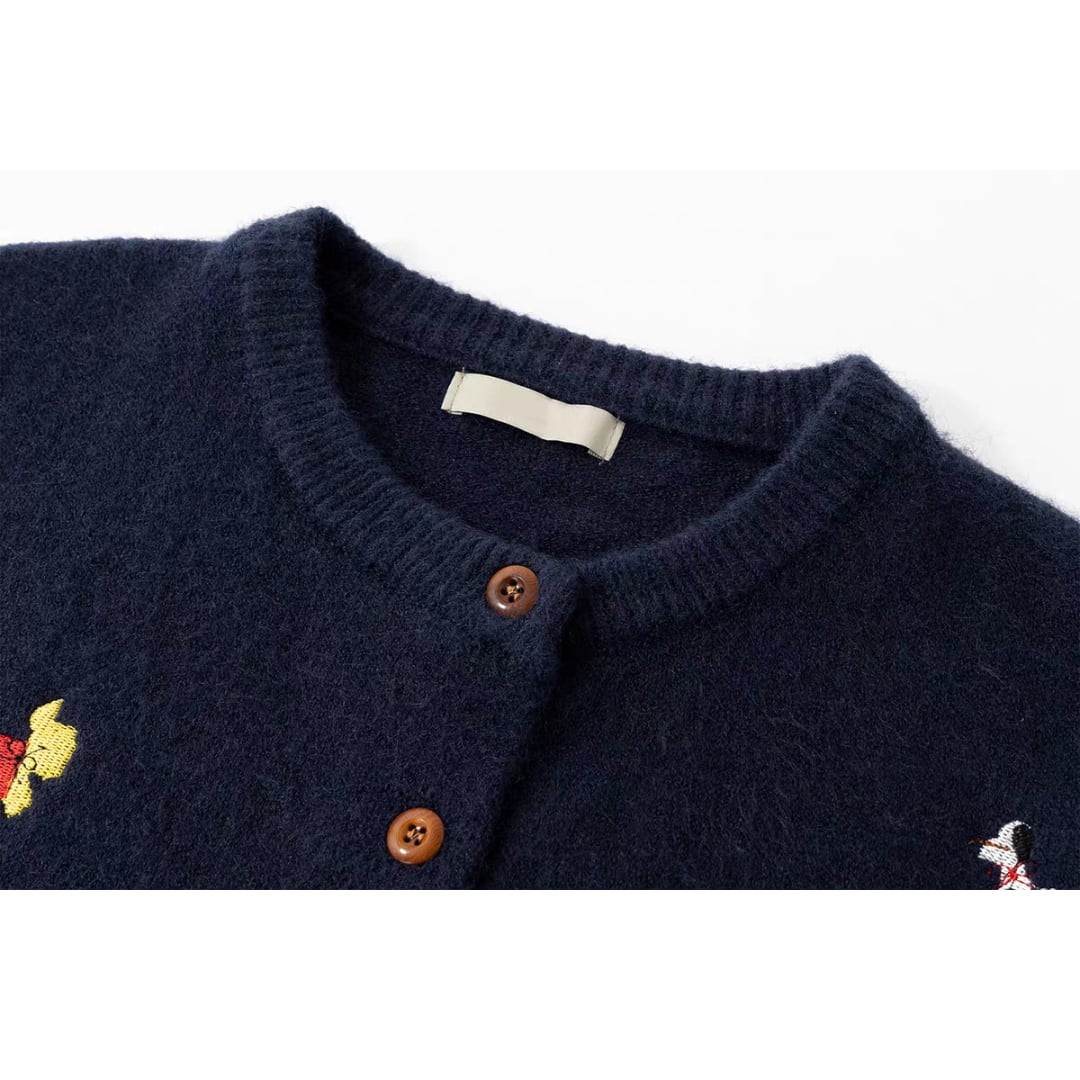 ドッグモチーフの刺繍が施された丸首ニットカーディガン。程よくゆとりあるシルエットで、快適な着心地を実現。シンプルなカーディガンだけで終わらない可愛さがコーディネイトのアクセントに。