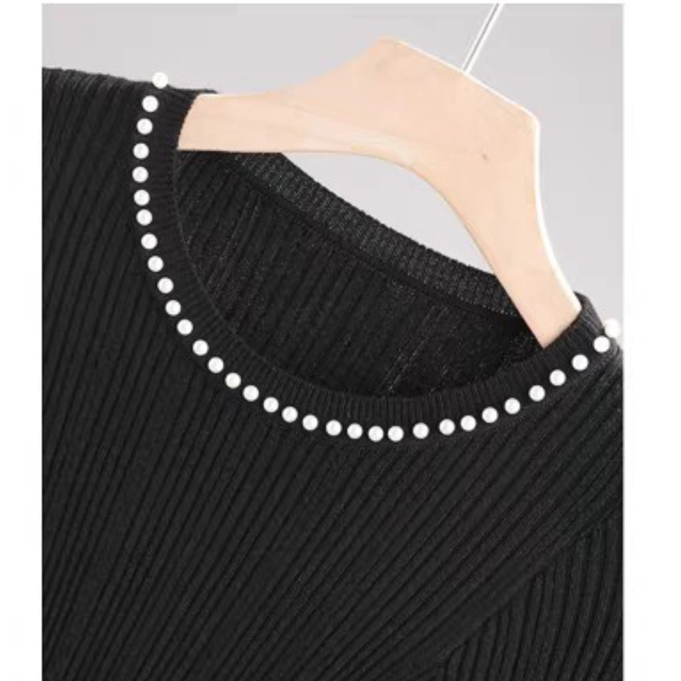 首元と袖口にパールがあしらわれた、上品な印象のニット。