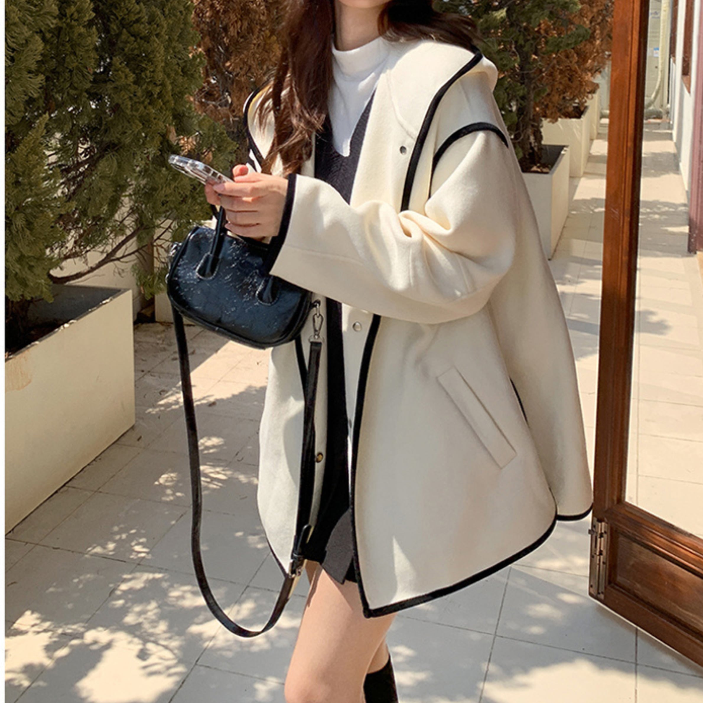 パイピングが目を引く、オーバーサイズコート。前面のボタンを留めてきちんと感を出したり、開けてカジュアルにしたりと、様々な着こなしが楽しめます。ちょっとしたお出かけにも、普段使いにもおすすめです。