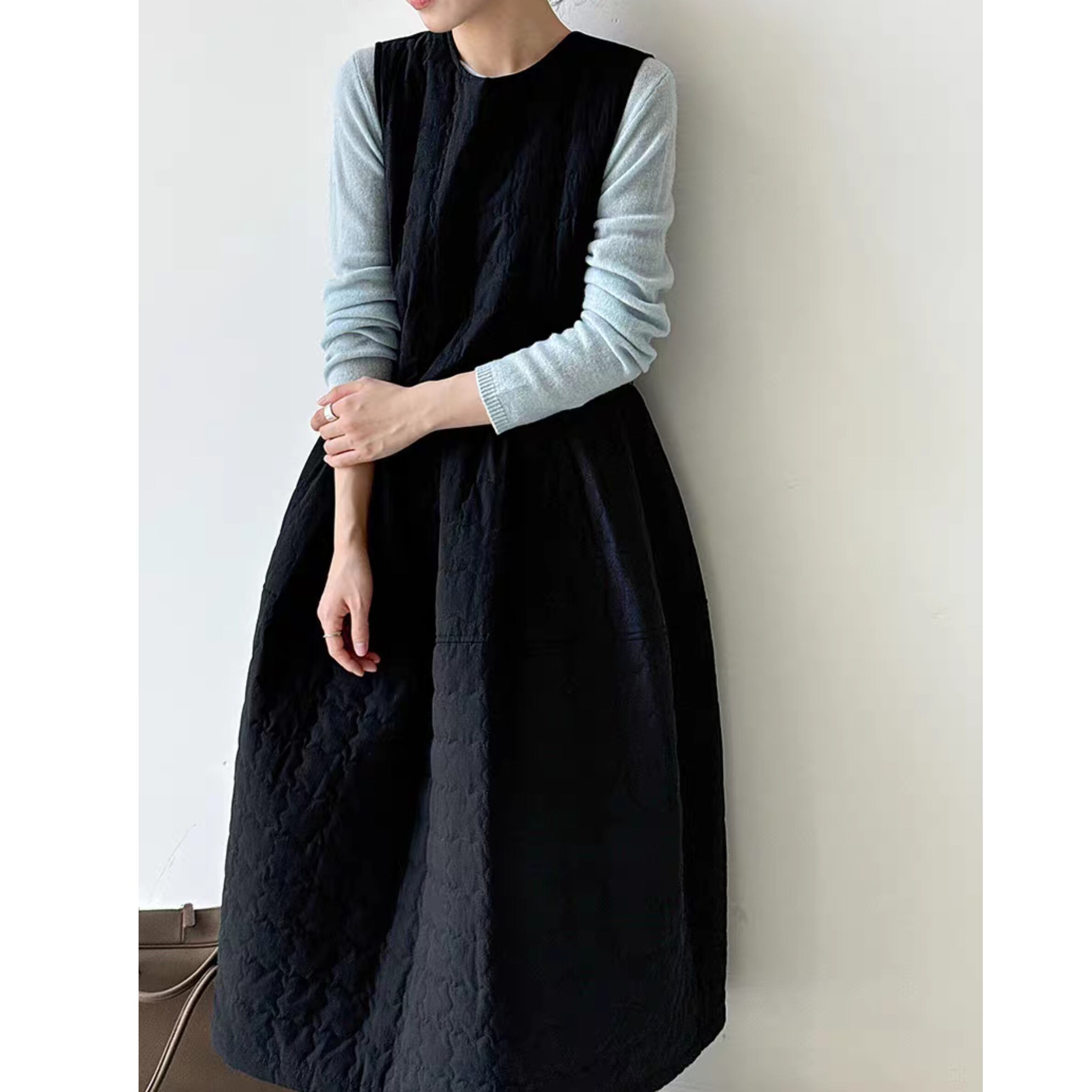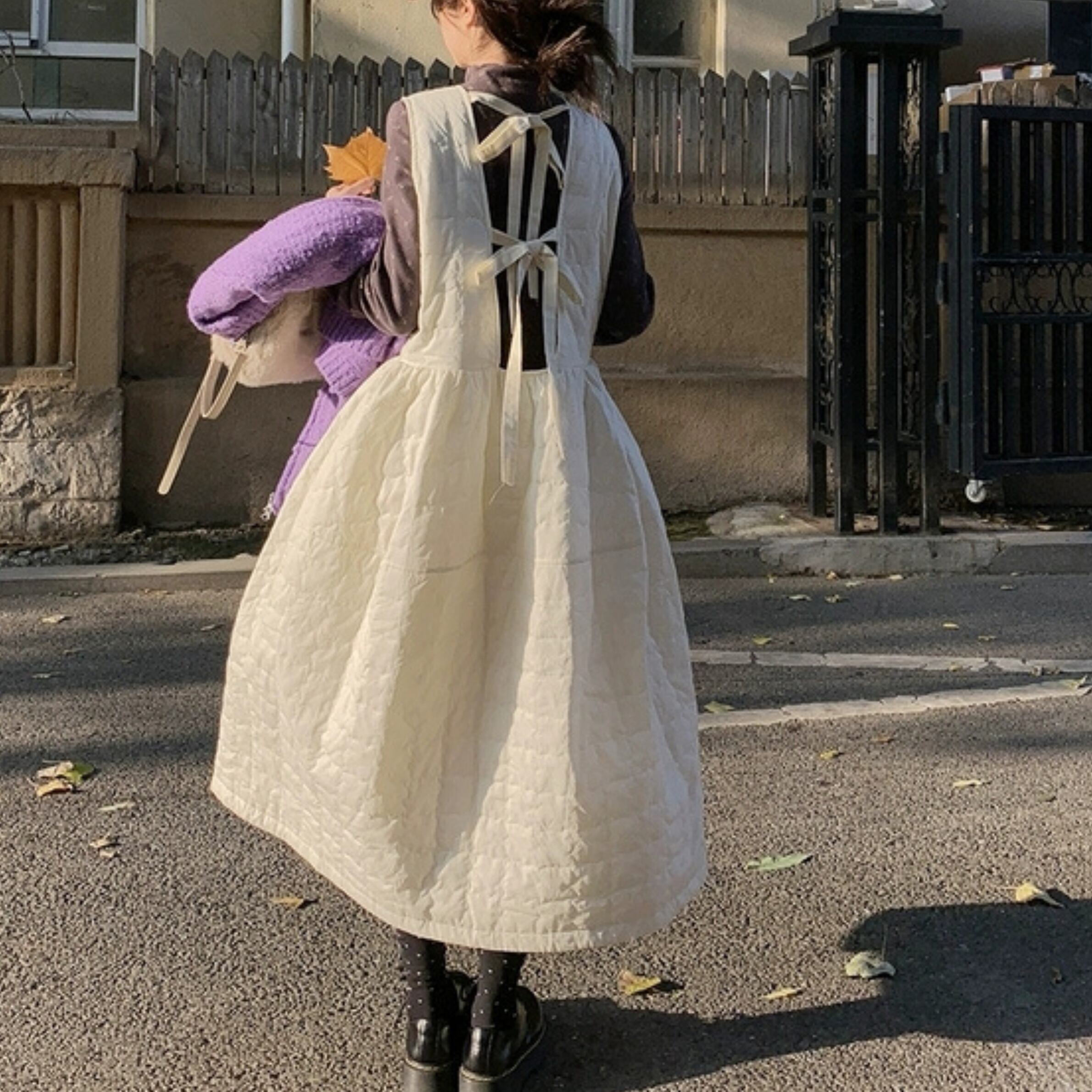 後ろ姿まで抜かりなく。リボンがアクセントになった、Aラインのジャンパースカート。普段使いはもちろん、ちょっとしたお出かけにも活躍する一枚です。