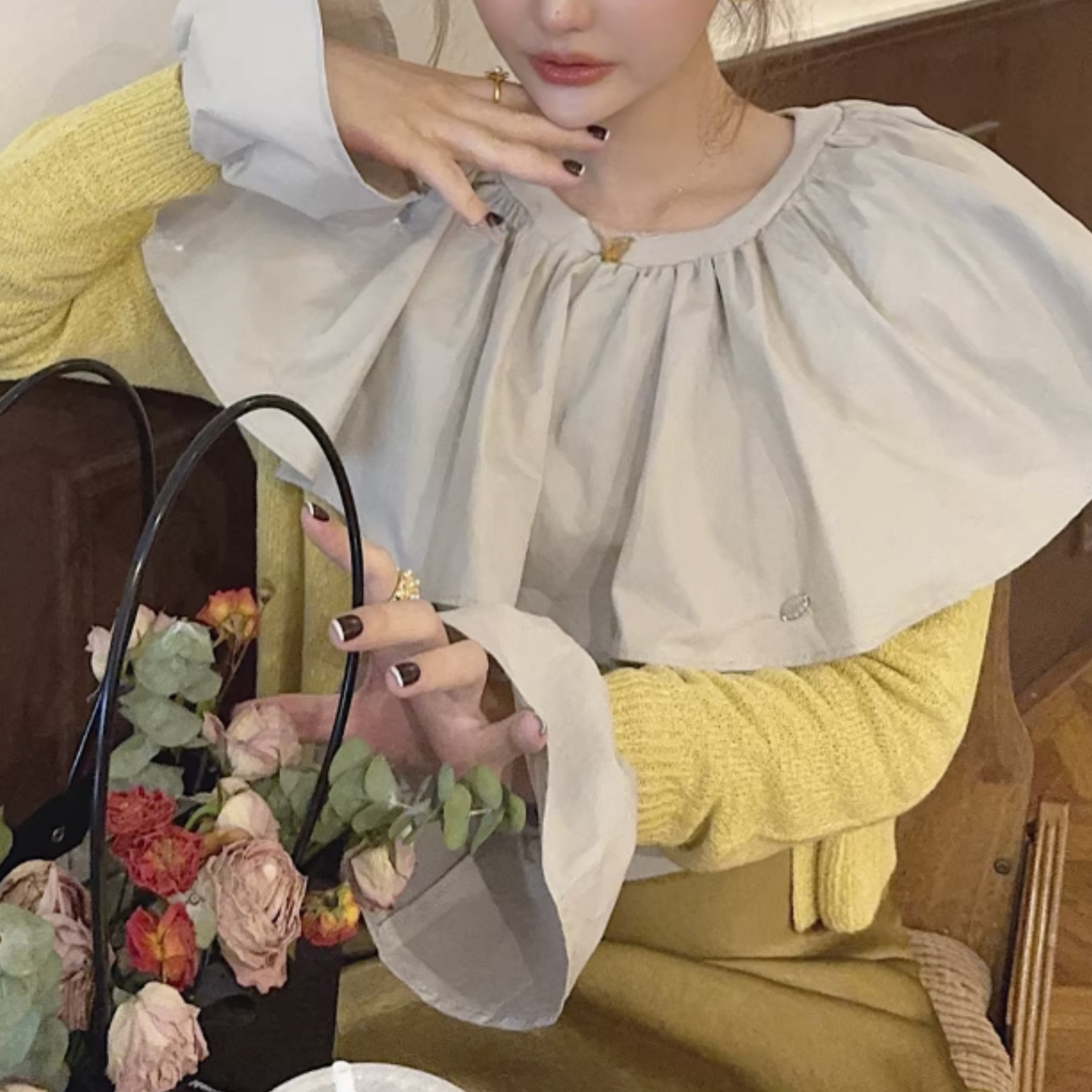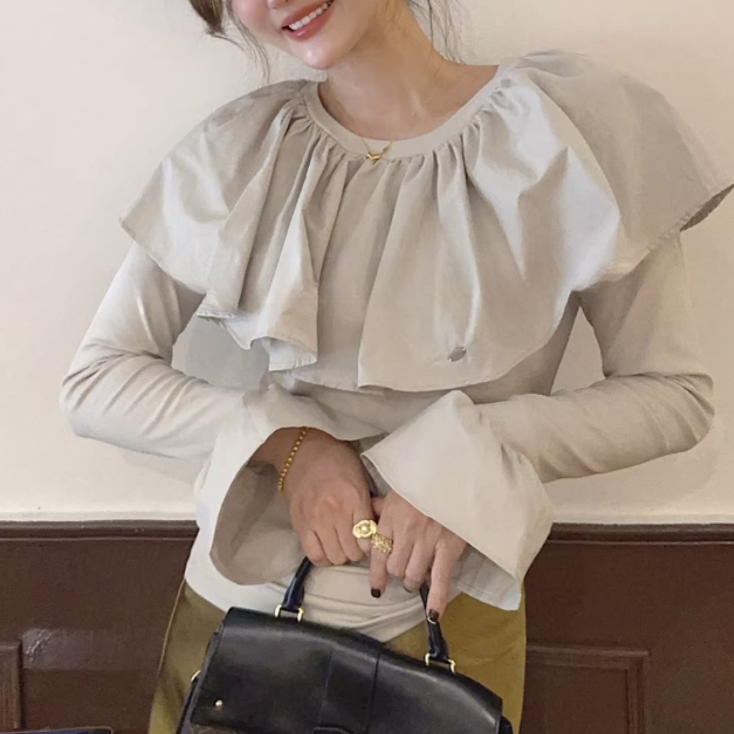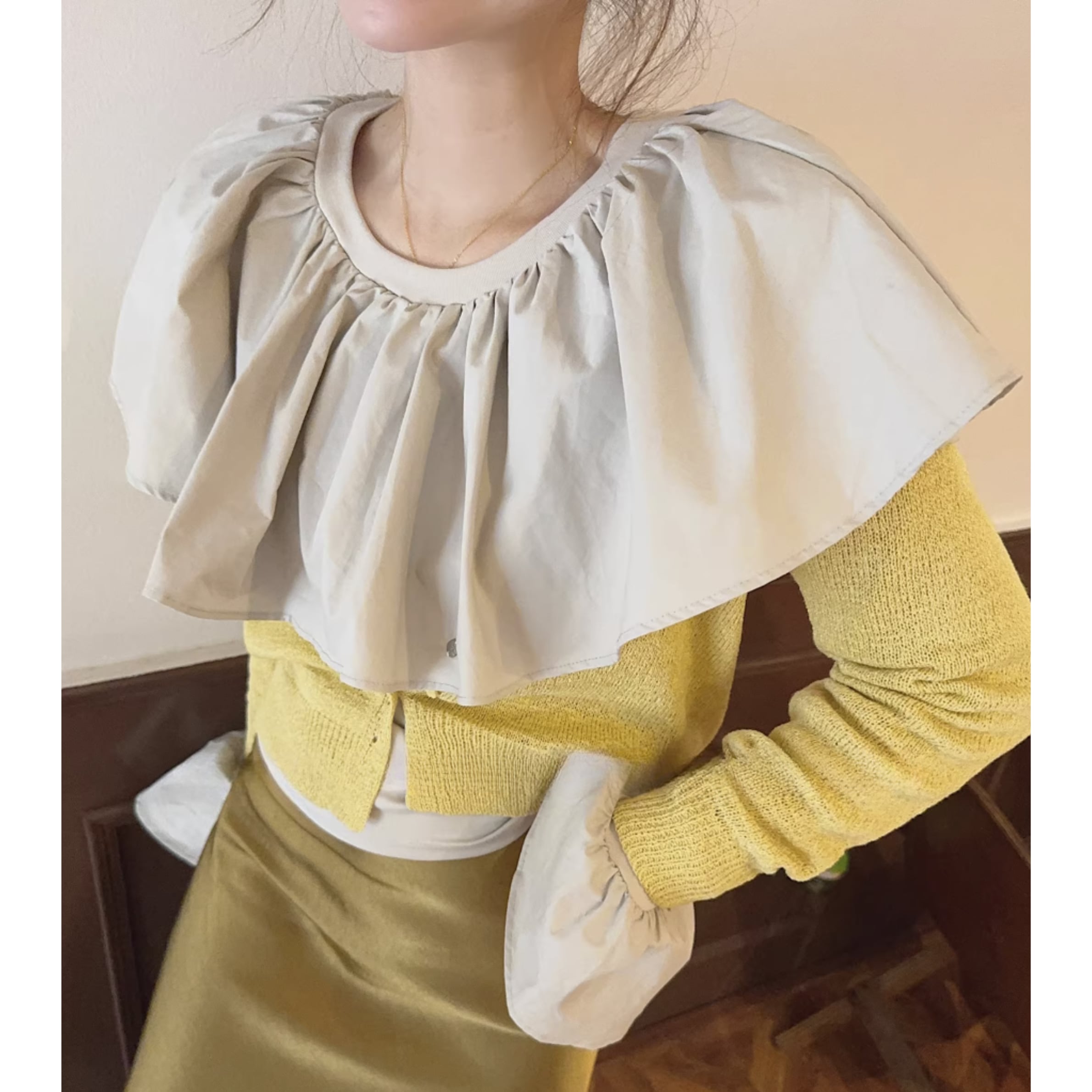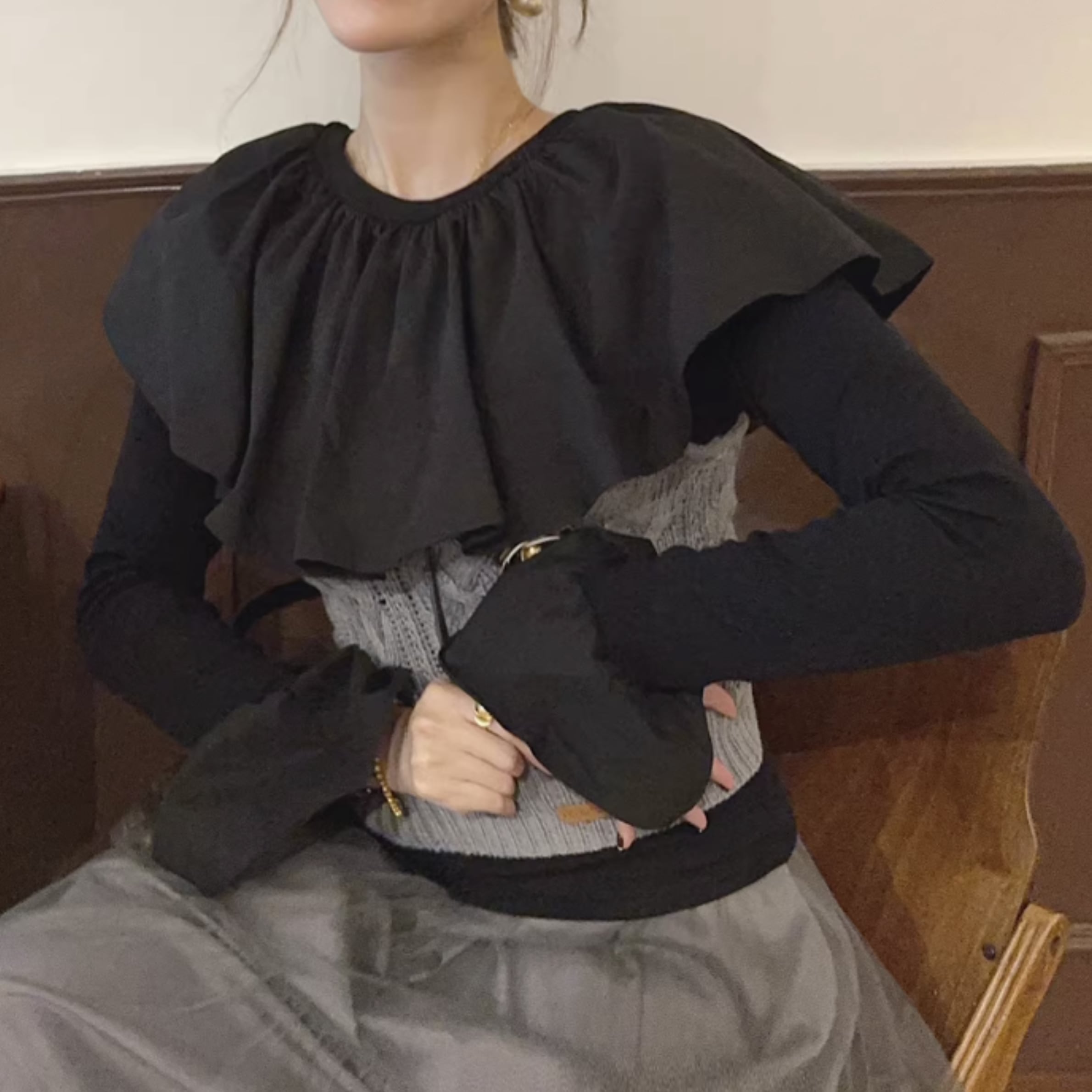 フリルネックとカットアウトディテールが特徴的なトップス。一枚で着るのはもちろん、ジャケットやカーディガンのインナーとしても活躍します。カジュアルな普段使いから、ちょっとしたお出かけまで、幅広いシーンで着回せるアイテムです。