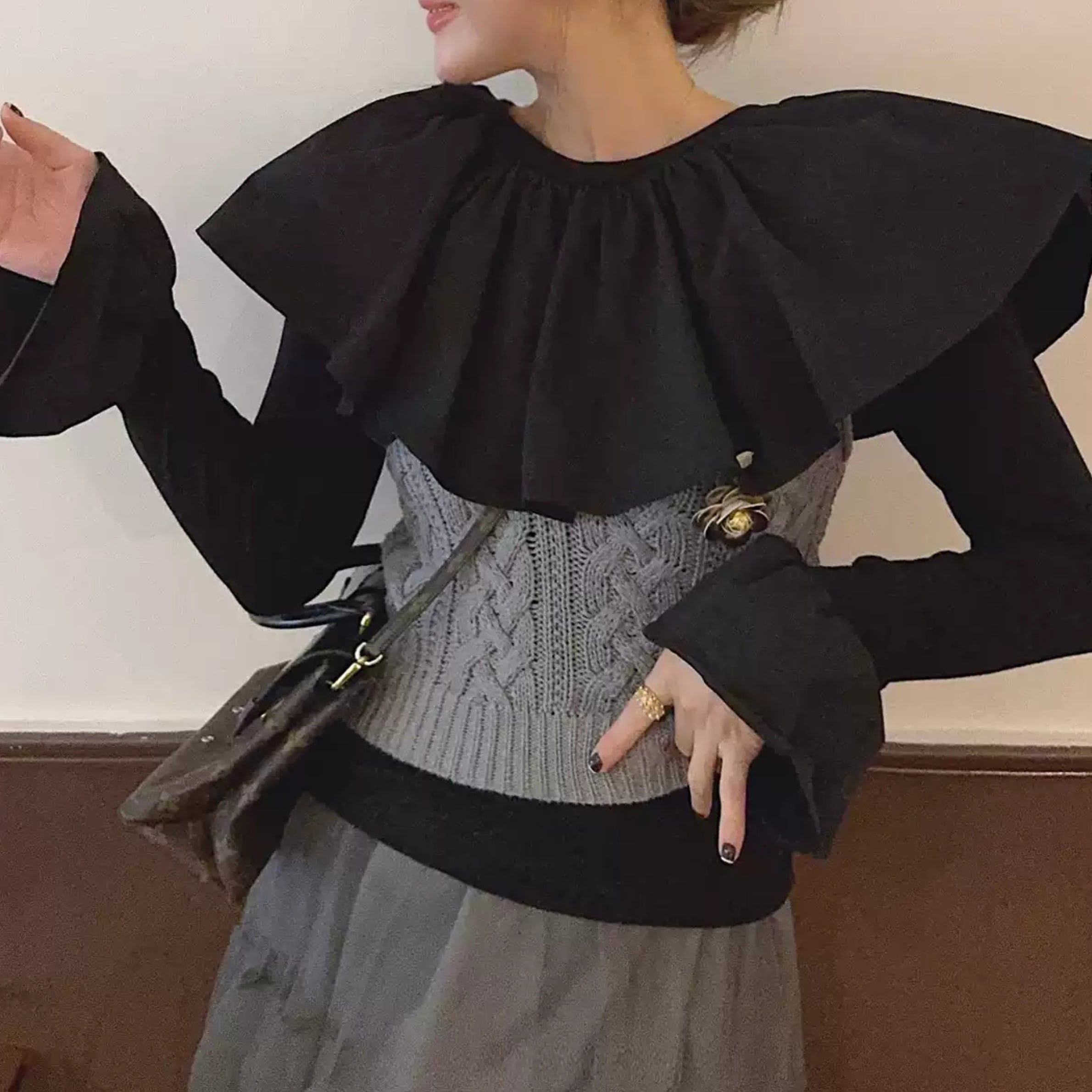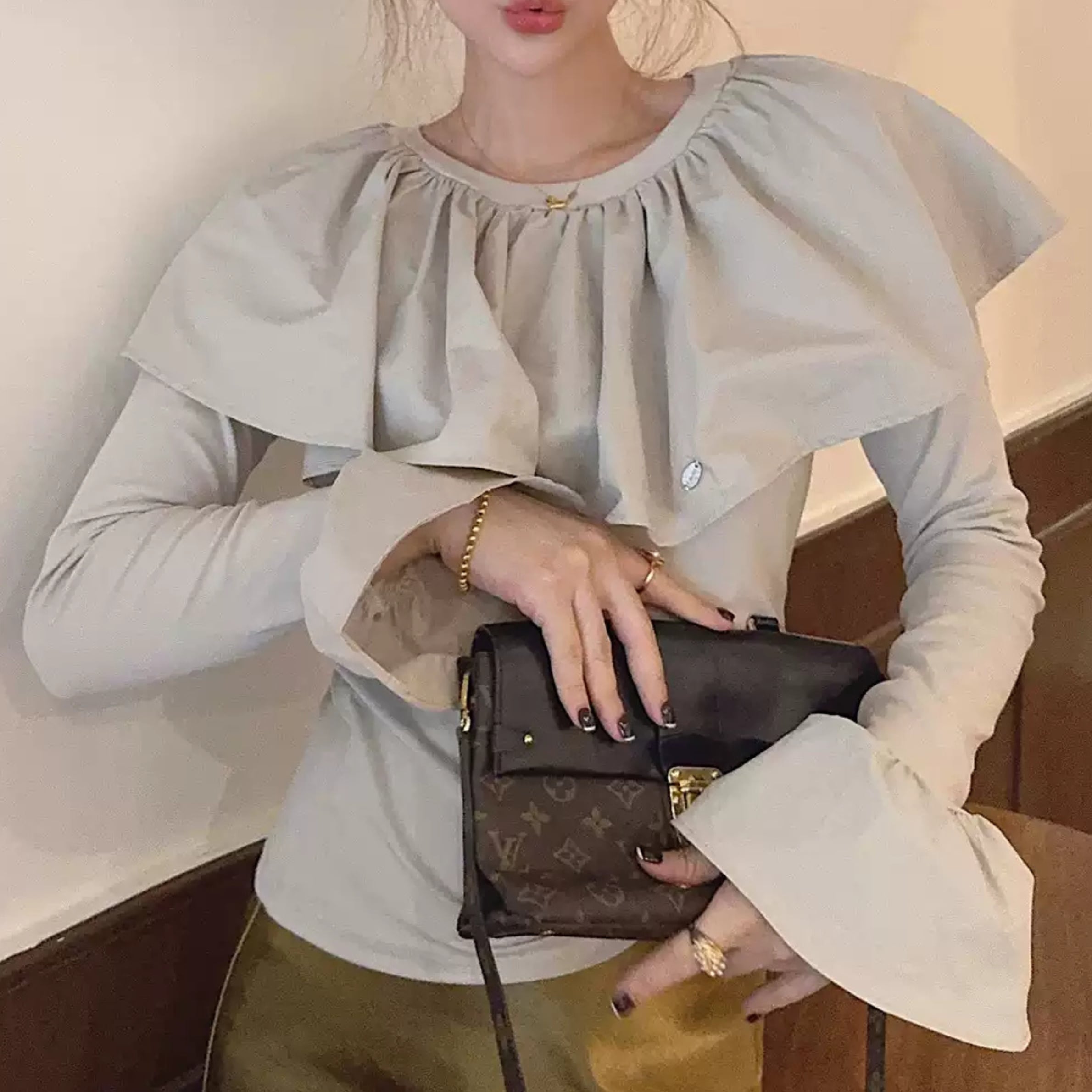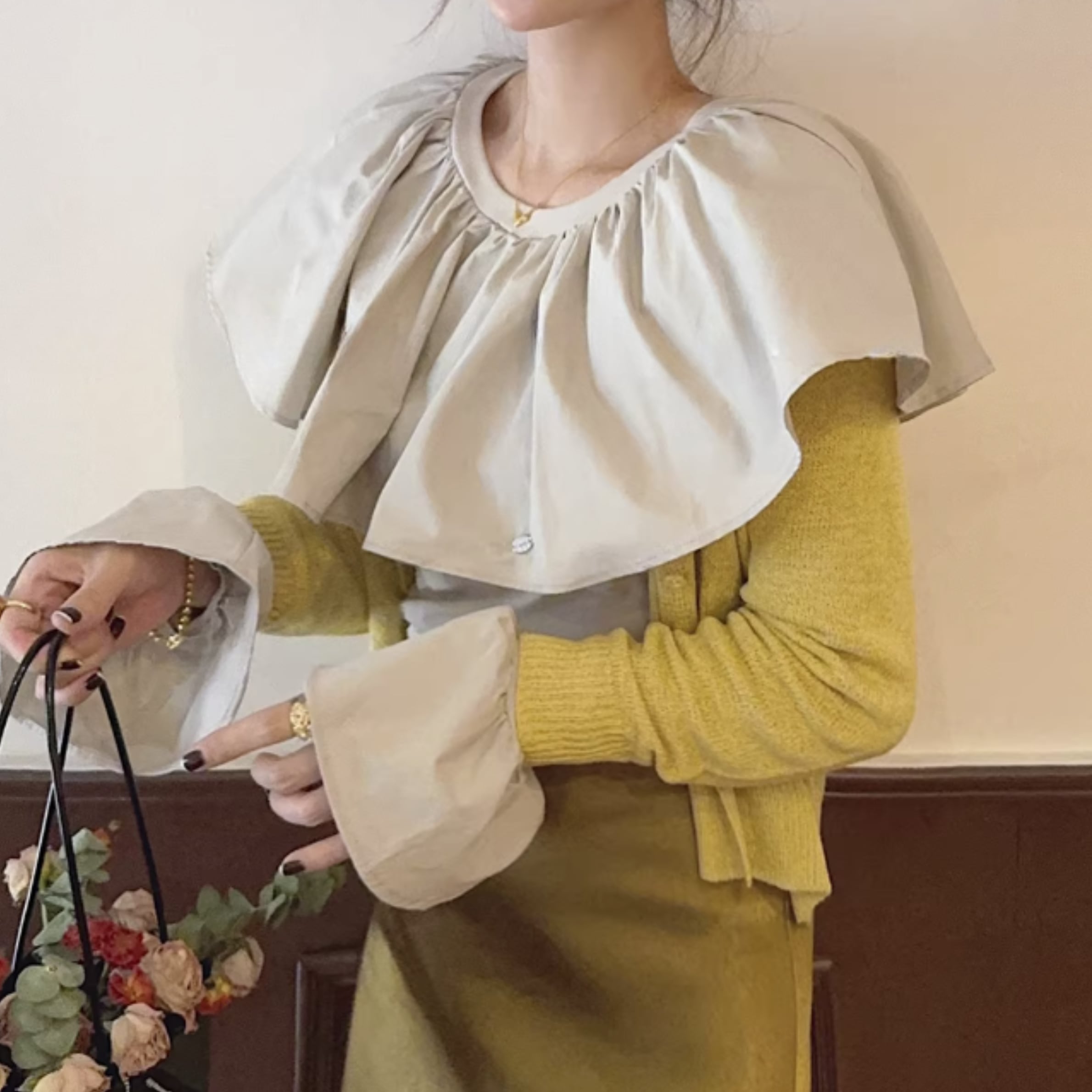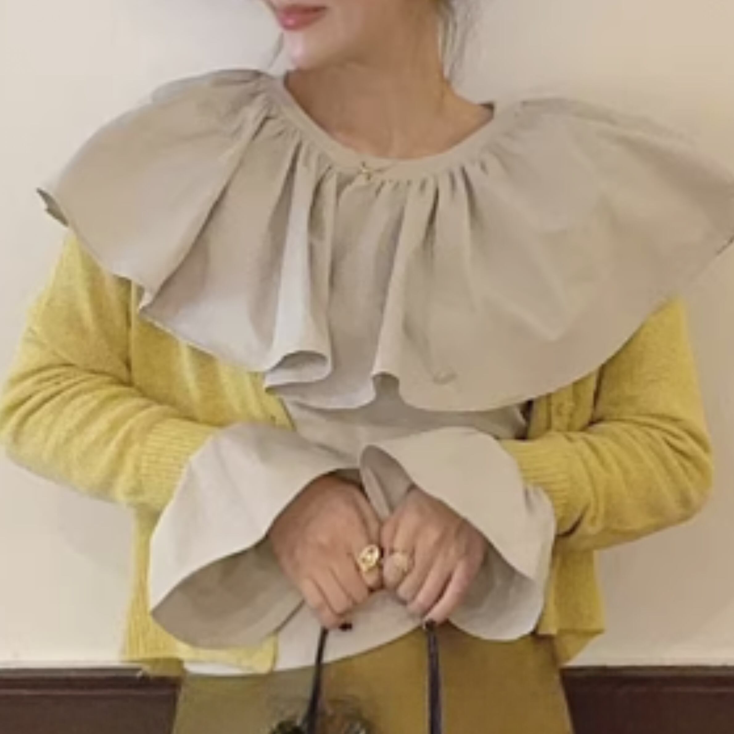 フリルネックとカットアウトディテールが特徴的なトップス。一枚で着るのはもちろん、ジャケットやカーディガンのインナーとしても活躍します。カジュアルな普段使いから、ちょっとしたお出かけまで、幅広いシーンで着回せるアイテムです。