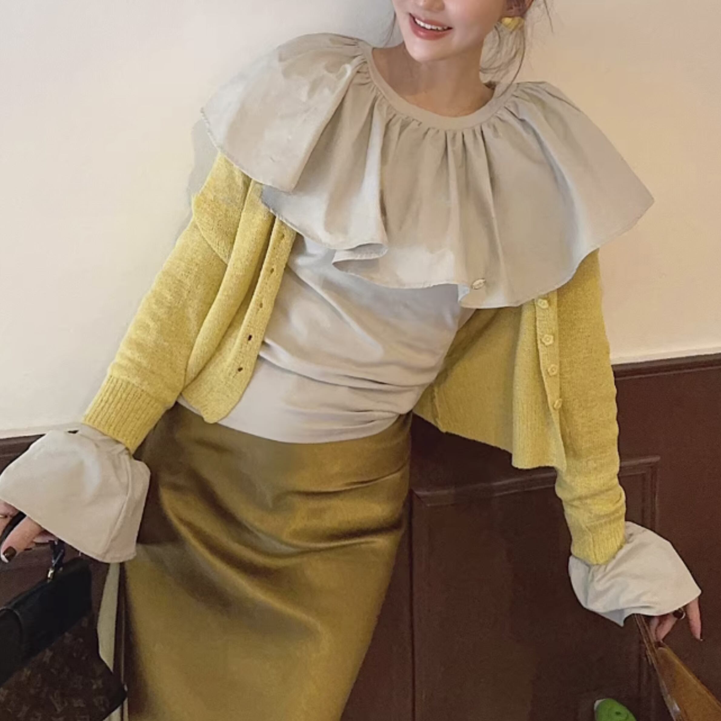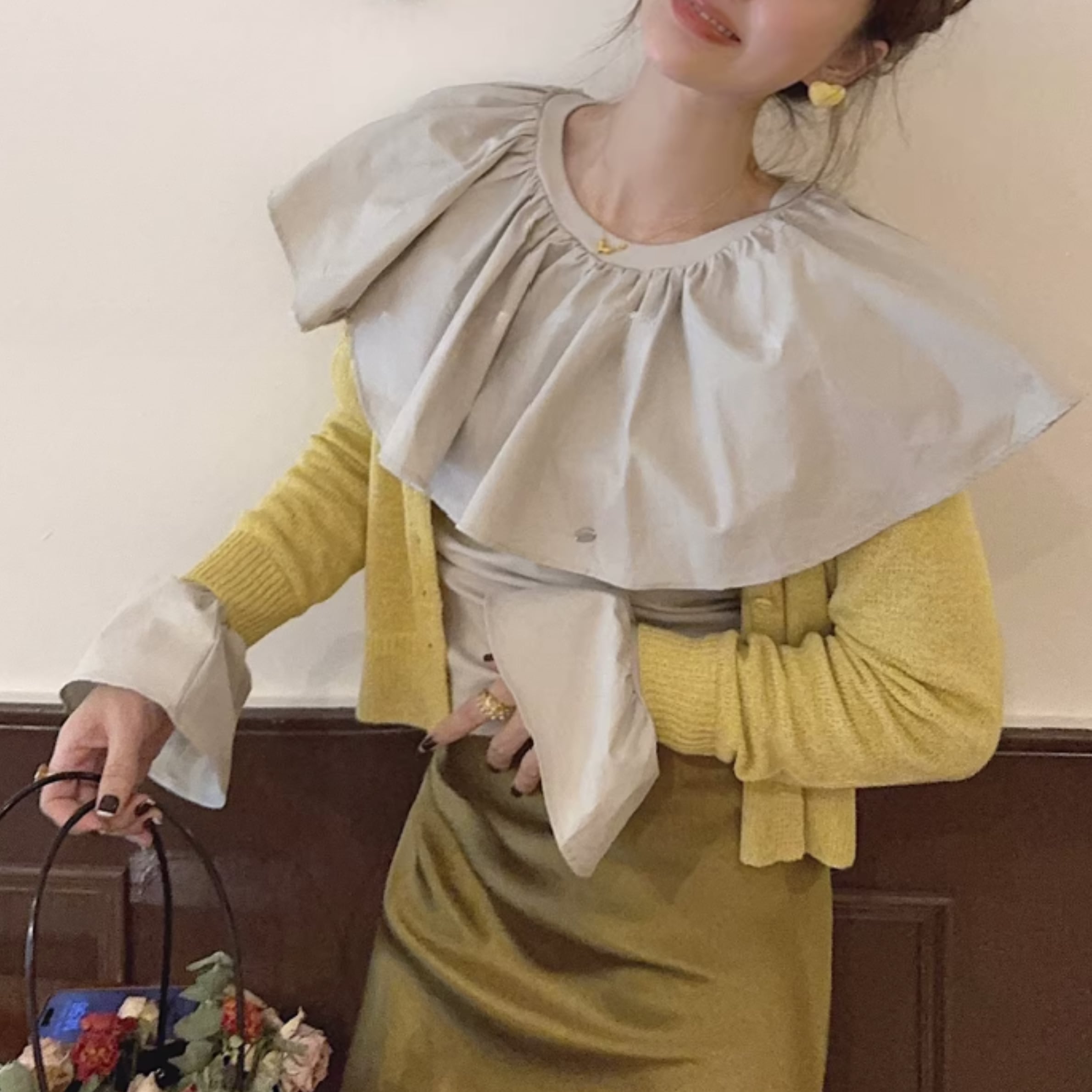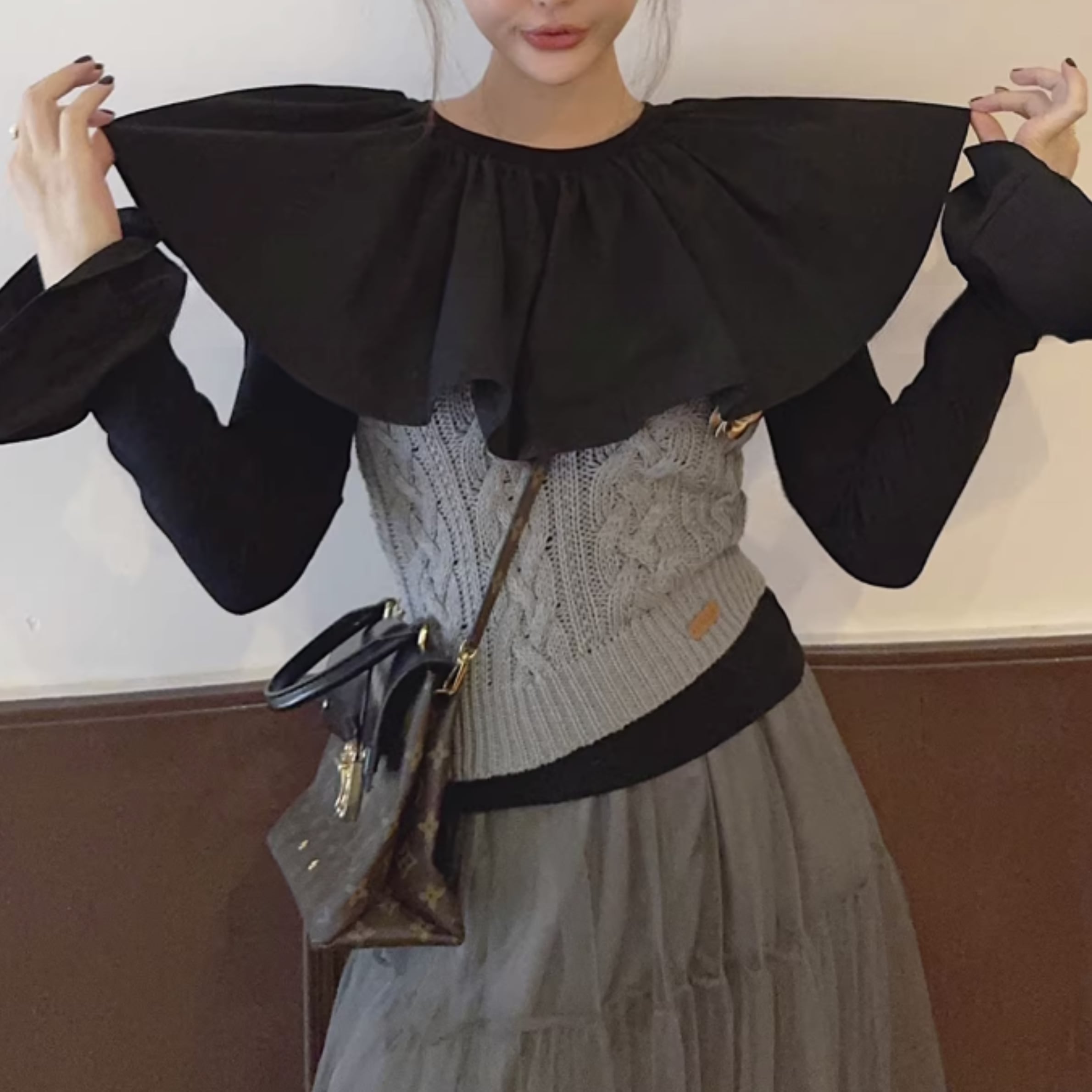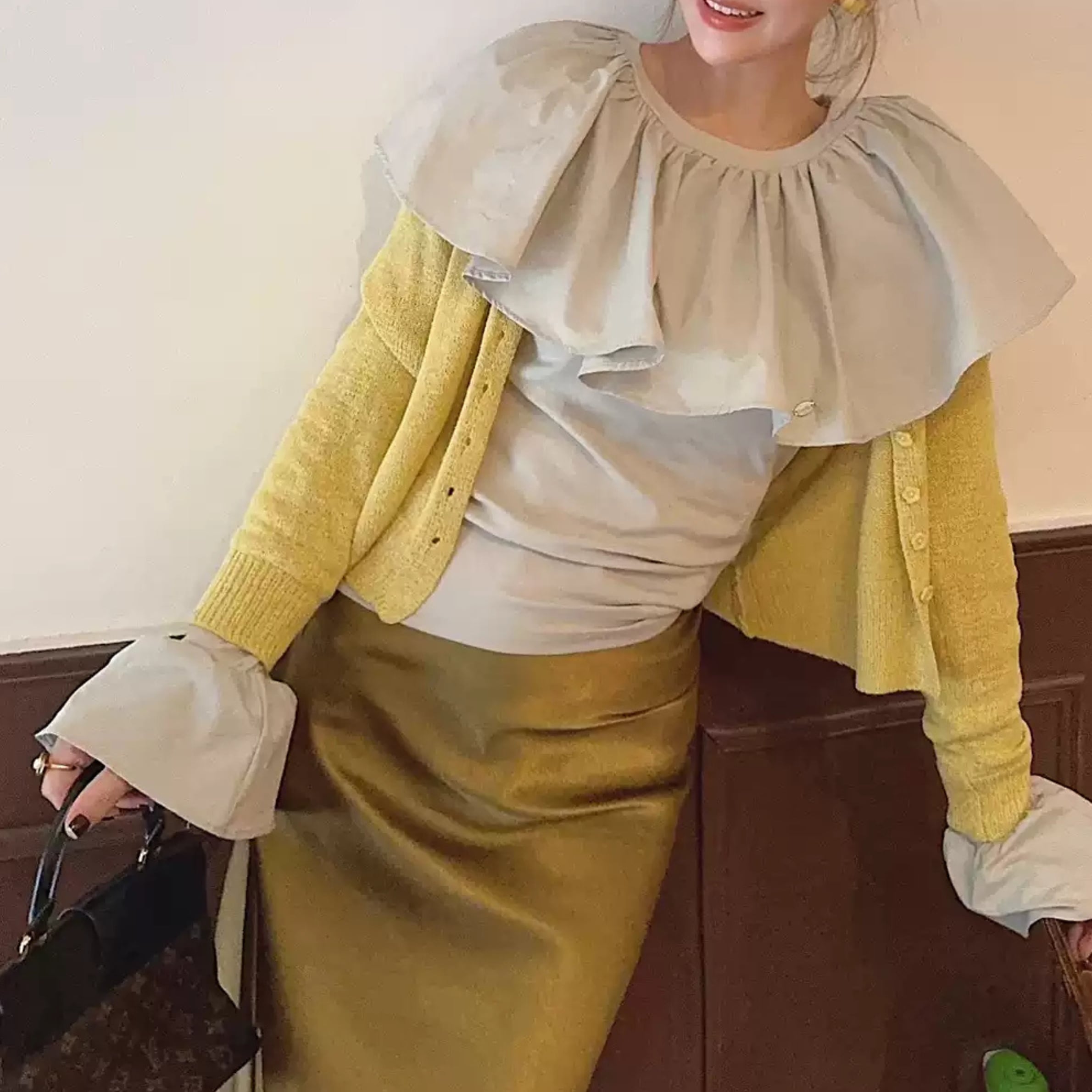 フリルネックとカットアウトディテールが特徴的なトップス。一枚で着るのはもちろん、ジャケットやカーディガンのインナーとしても活躍します。カジュアルな普段使いから、ちょっとしたお出かけまで、幅広いシーンで着回せるアイテムです。