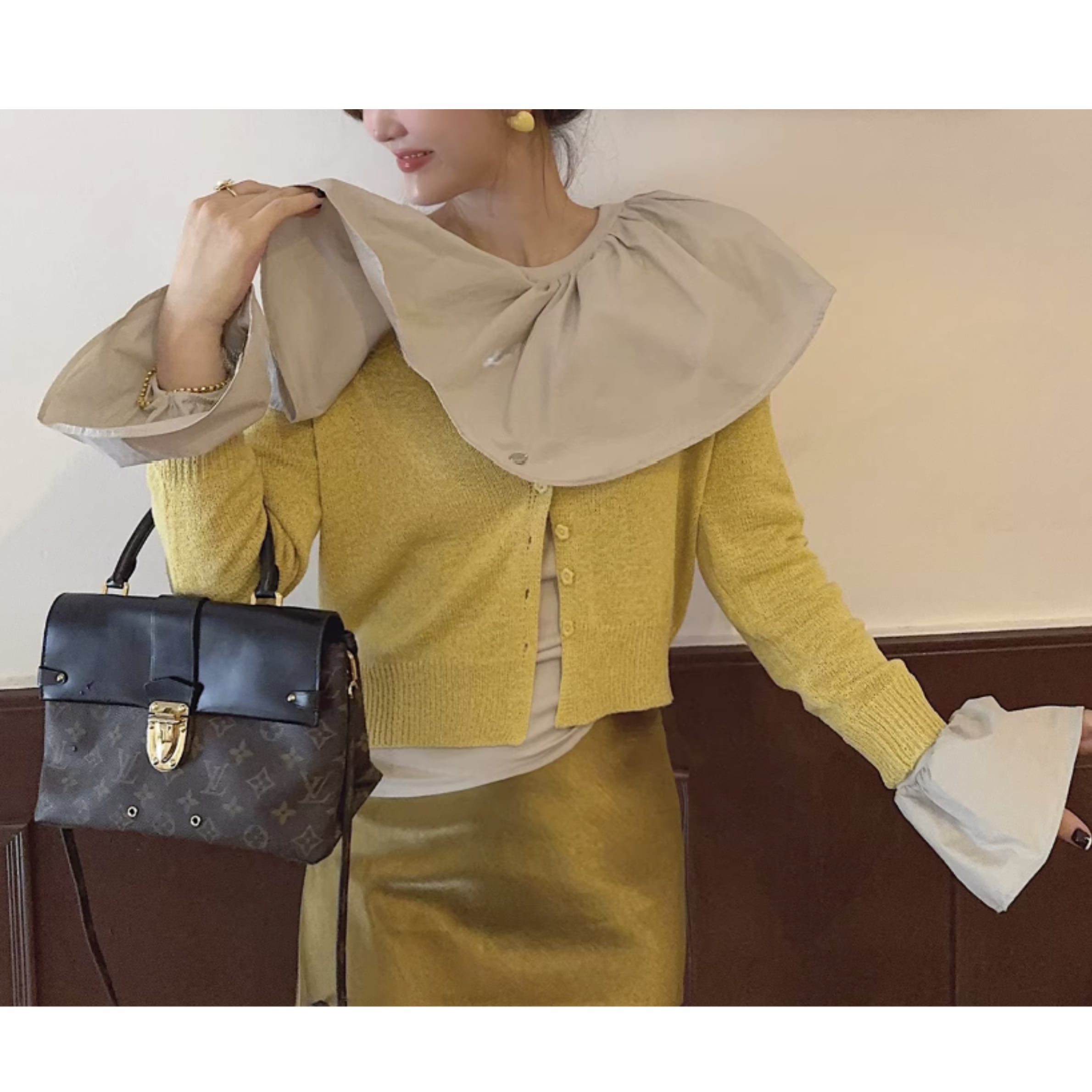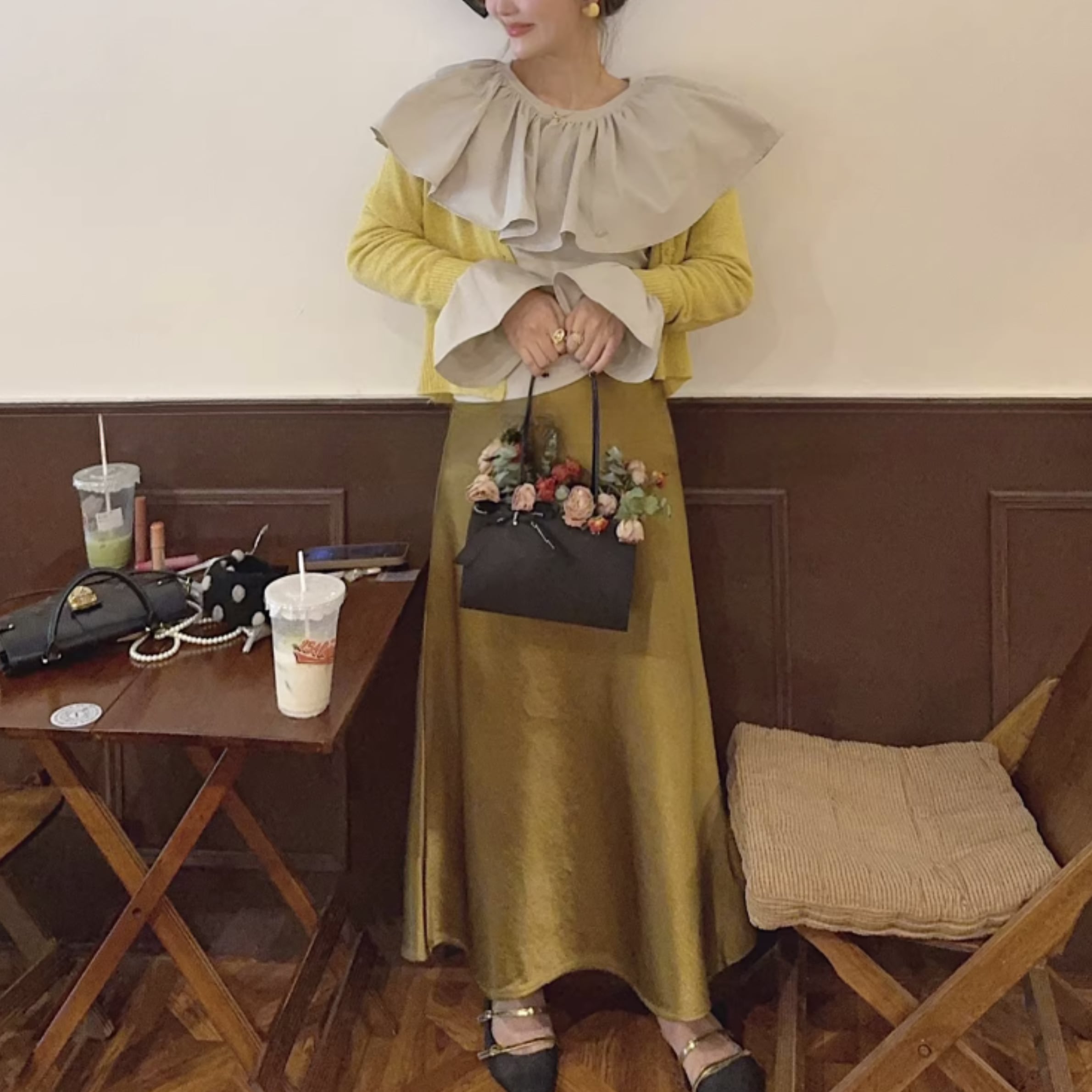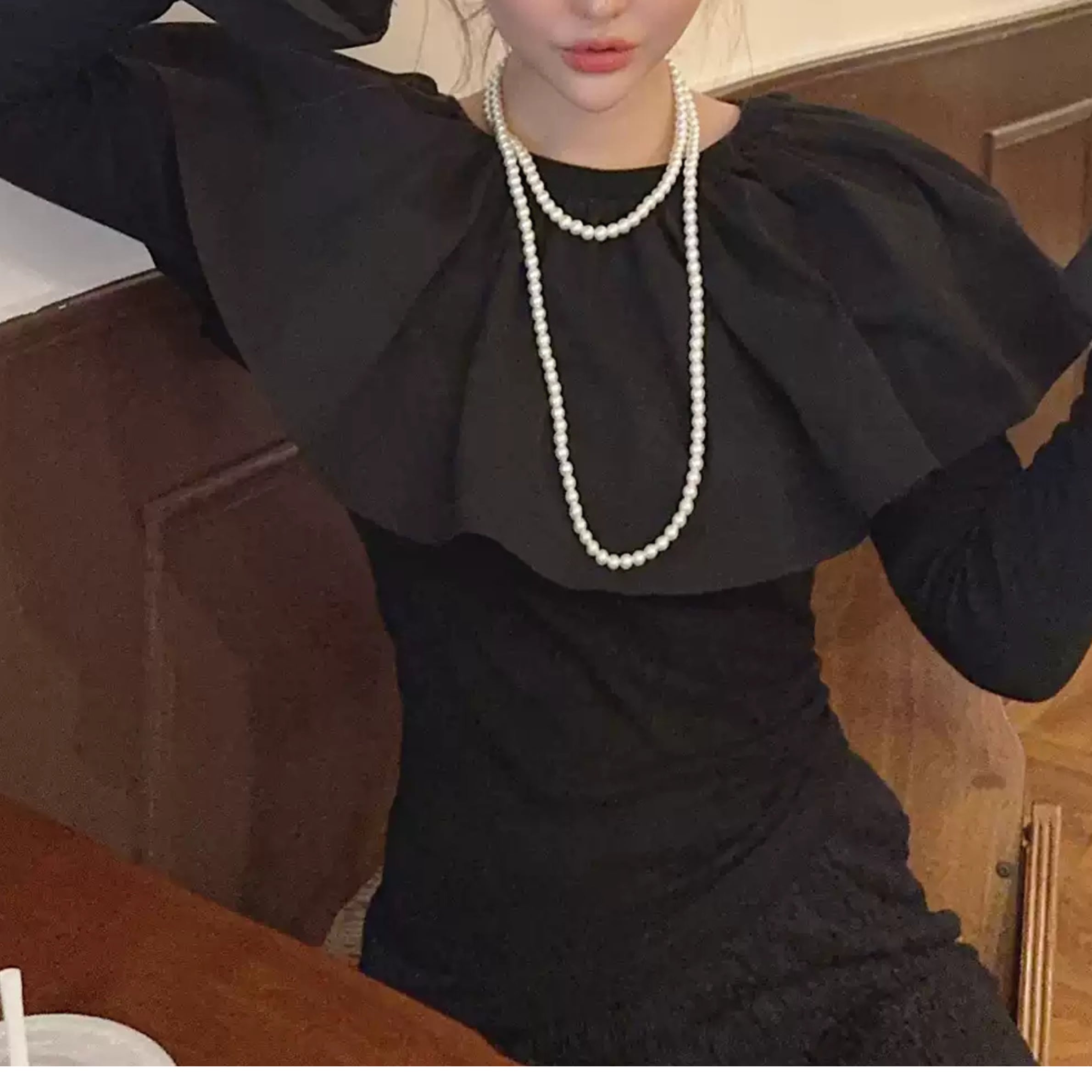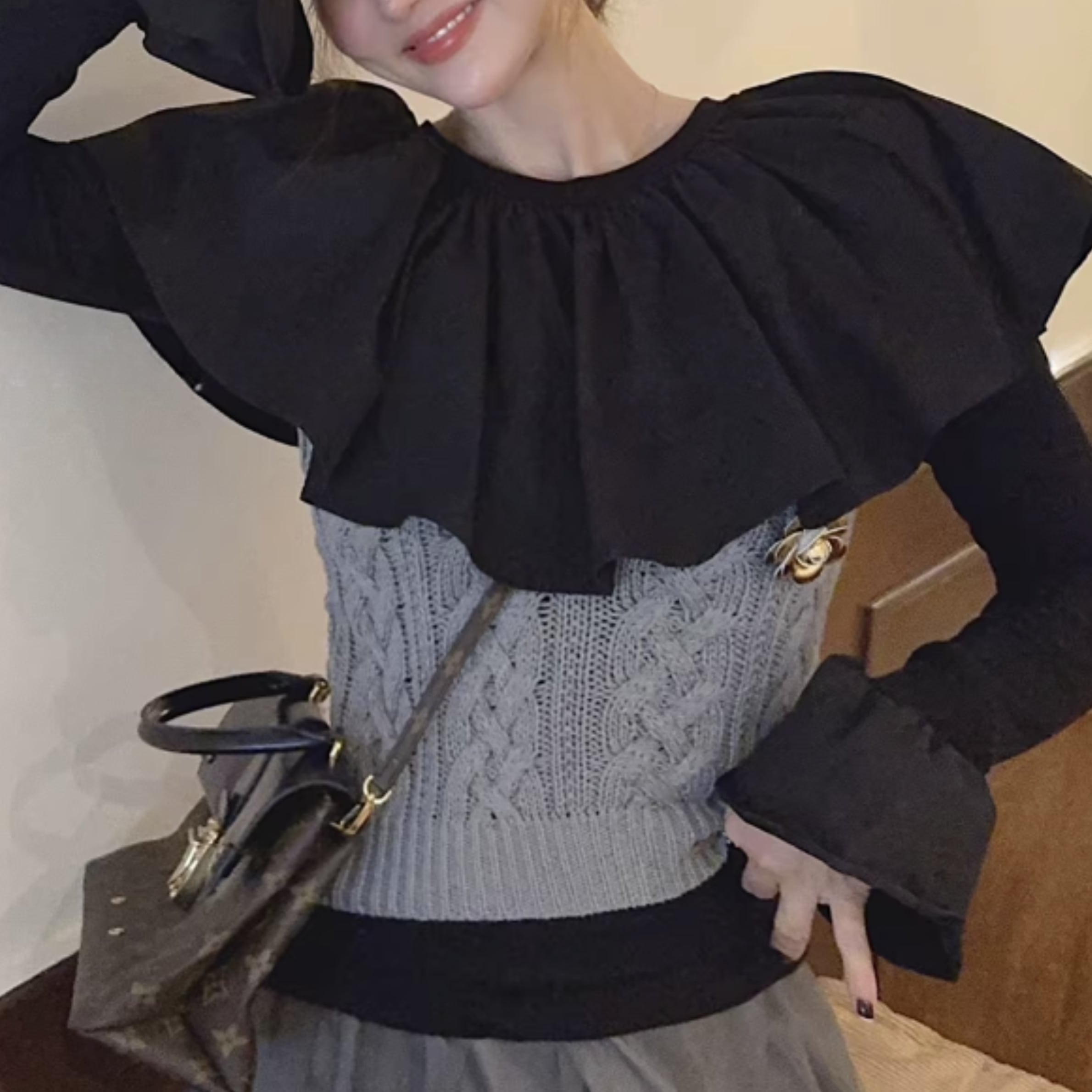 フリルネックとカットアウトディテールが特徴的なトップス。一枚で着るのはもちろん、ジャケットやカーディガンのインナーとしても活躍します。カジュアルな普段使いから、ちょっとしたお出かけまで、幅広いシーンで着回せるアイテムです。