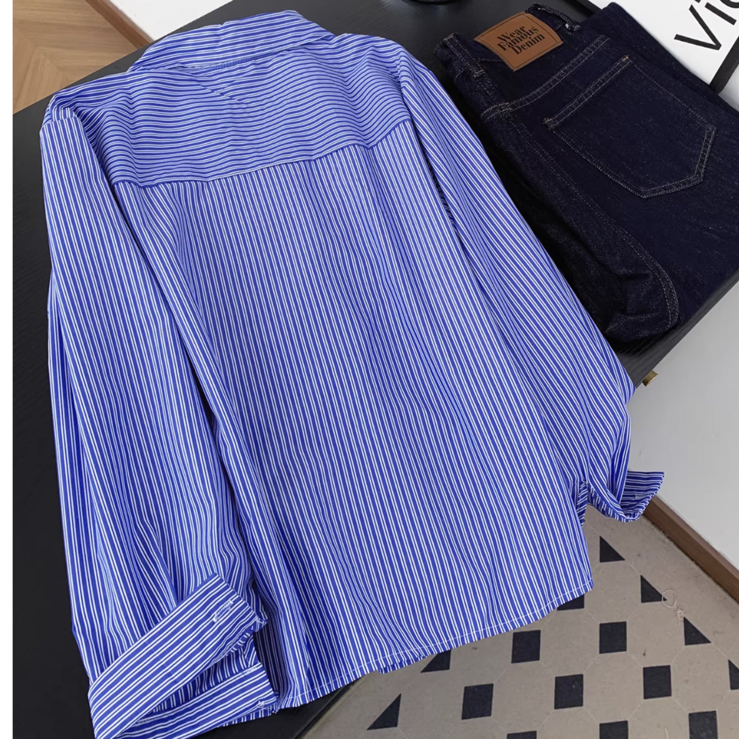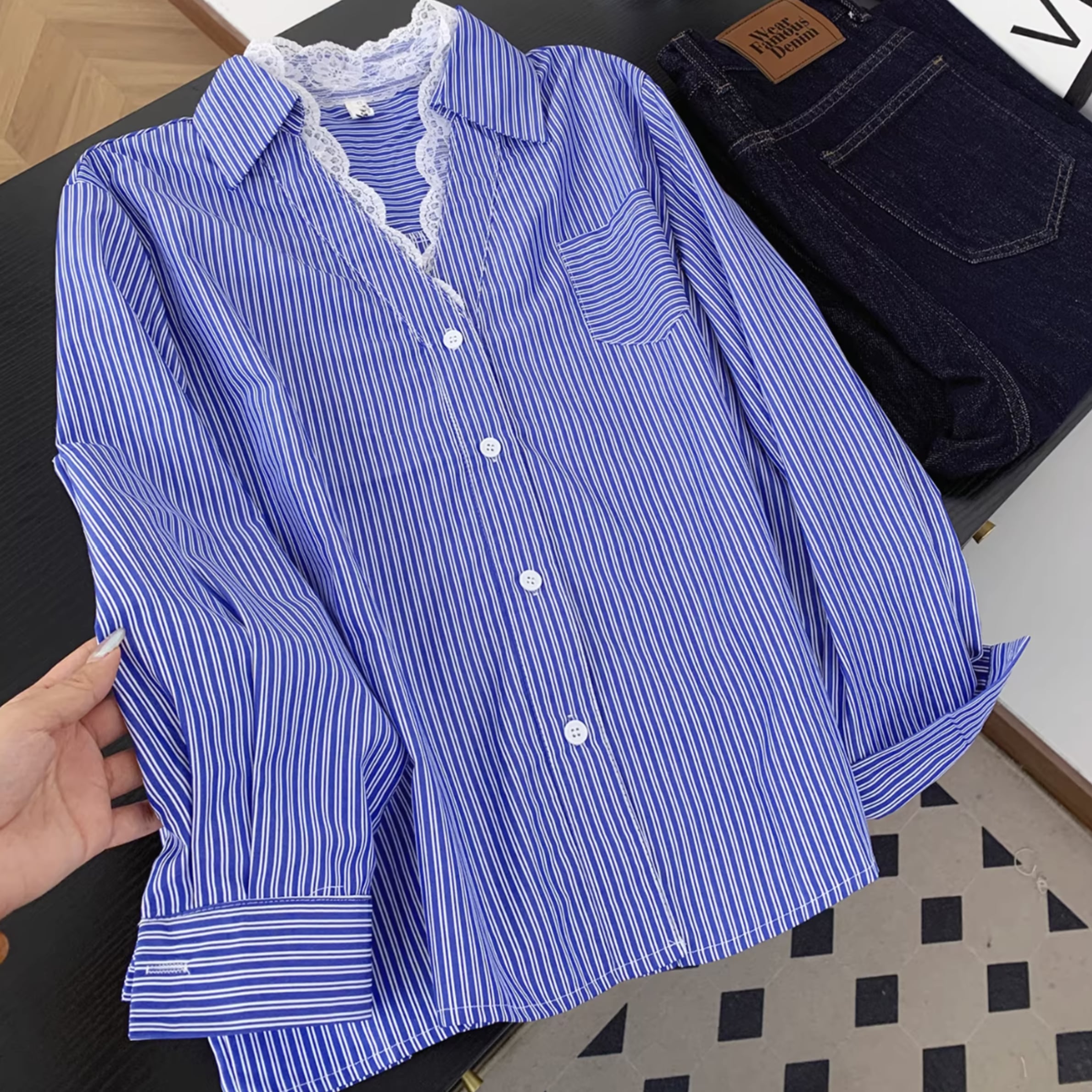 カジュアルながらも、襟元のレースが上品さを演出するブラウス。