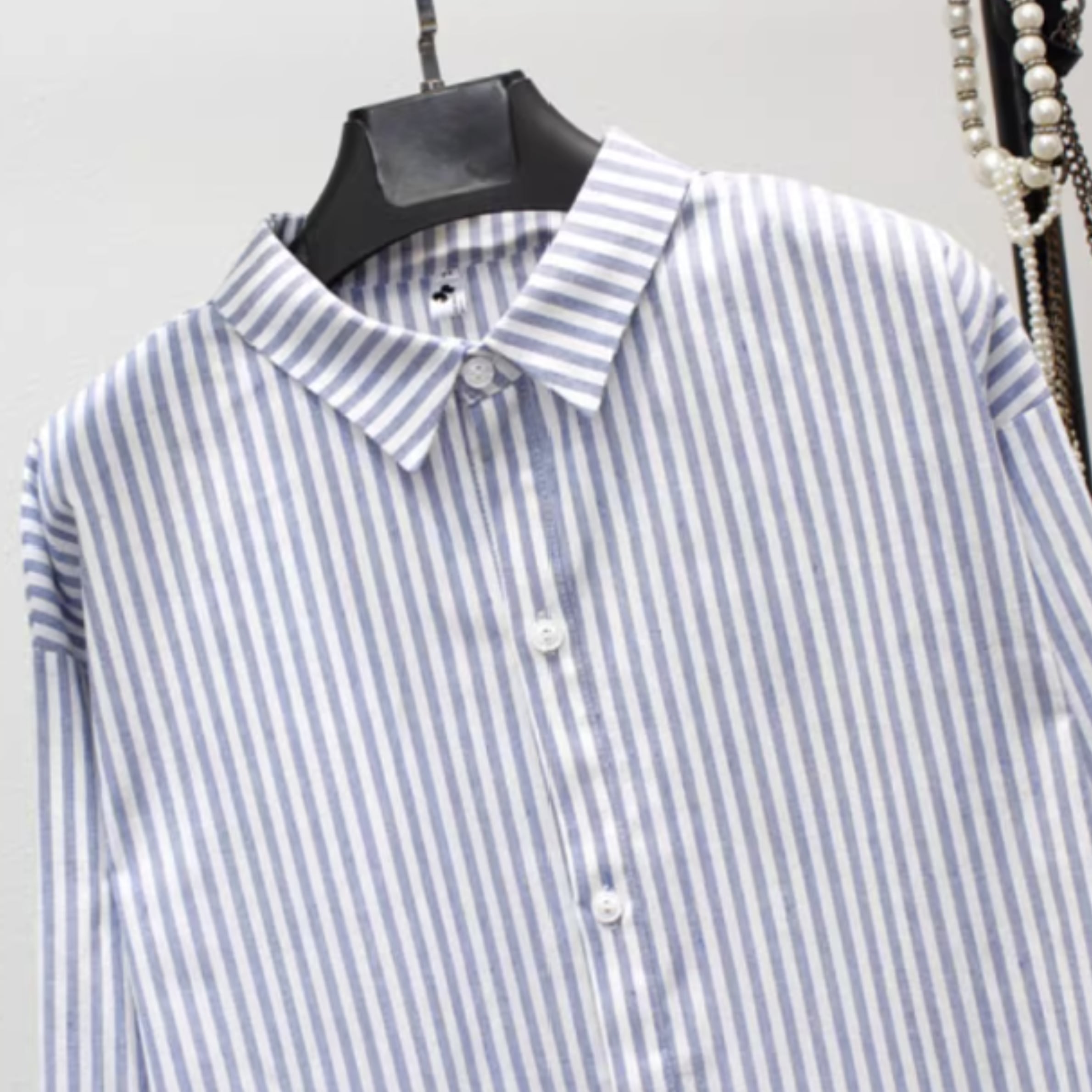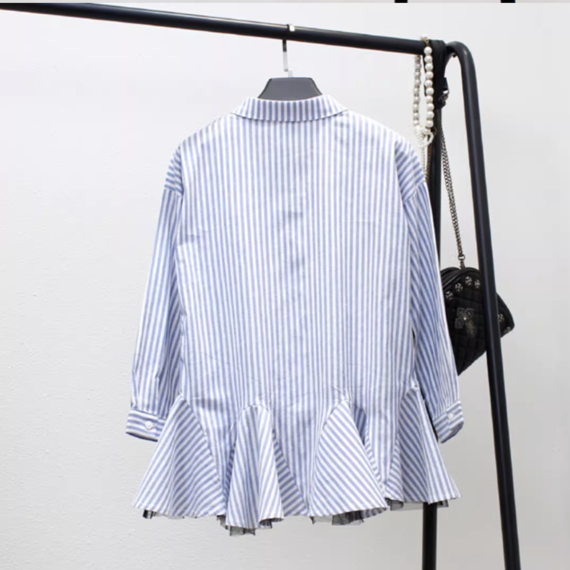 一枚でコーディネートが完成するシャツワンピース。爽やかなストライプ柄が、裾フリルとチュールデザインを程よくカジュアルダウンし上品な雰囲気を演出します。オフィススタイルにはもちろん、休日のリラックススタイルにもおすすめです。