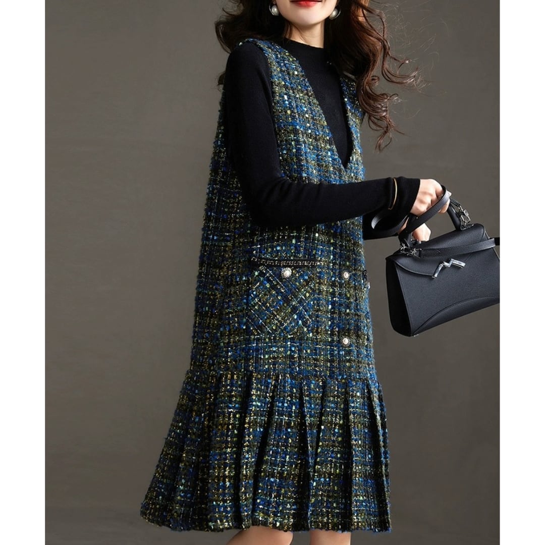 【大人気】チェックと裾のプリーツが大人可愛いジャンパースカート。インナーにはホワイトなどの明るい色を合わせても素敵。