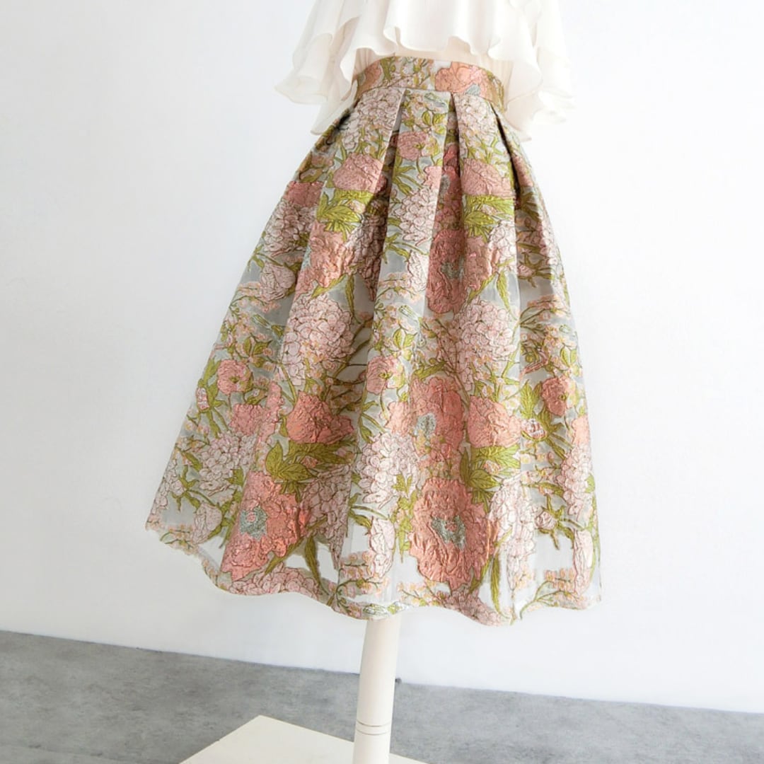 美しい花柄が織り込まれたミモレ丈プリーツスカート。上品なデザインとシルエットで、特別な日の装いを華やかに彩ります。