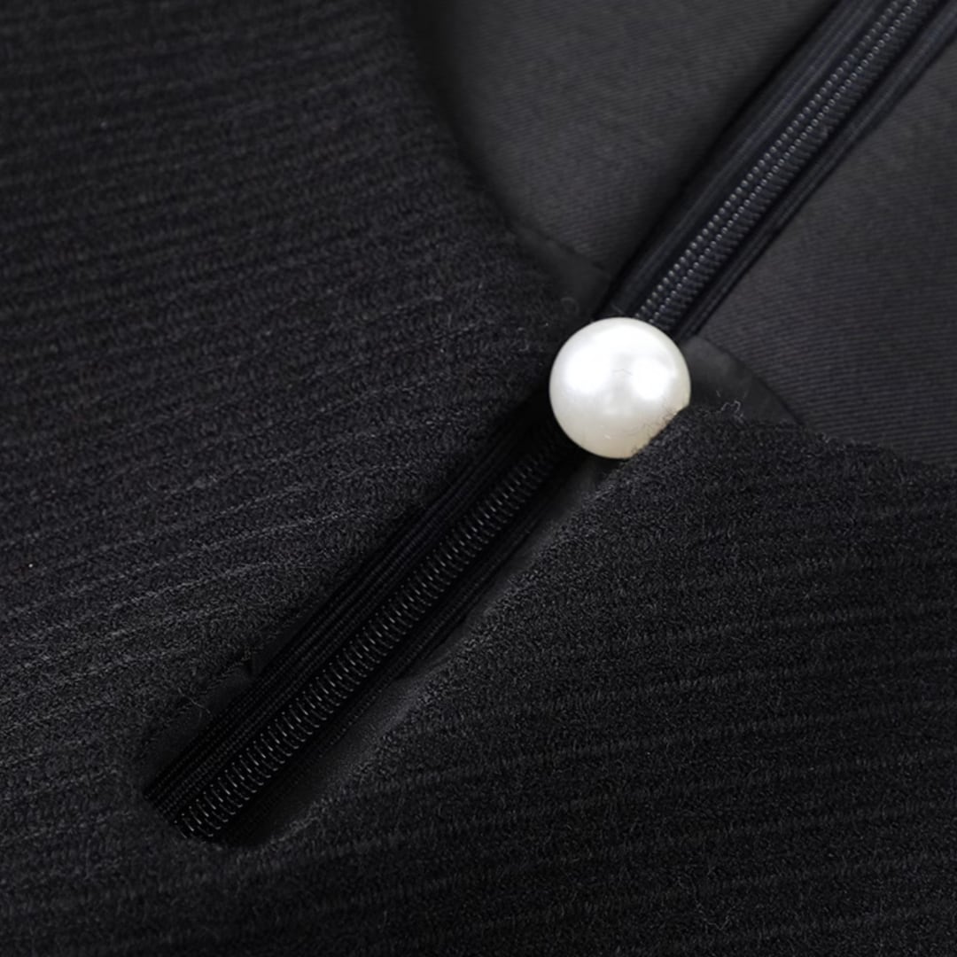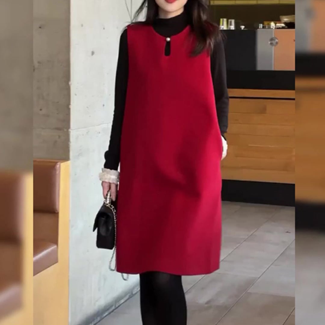 Aラインシルエットが美しいロング丈ワンピース。フロントのパールが上品さを際立たせ、一枚で洗練されたスタイルを演出します。